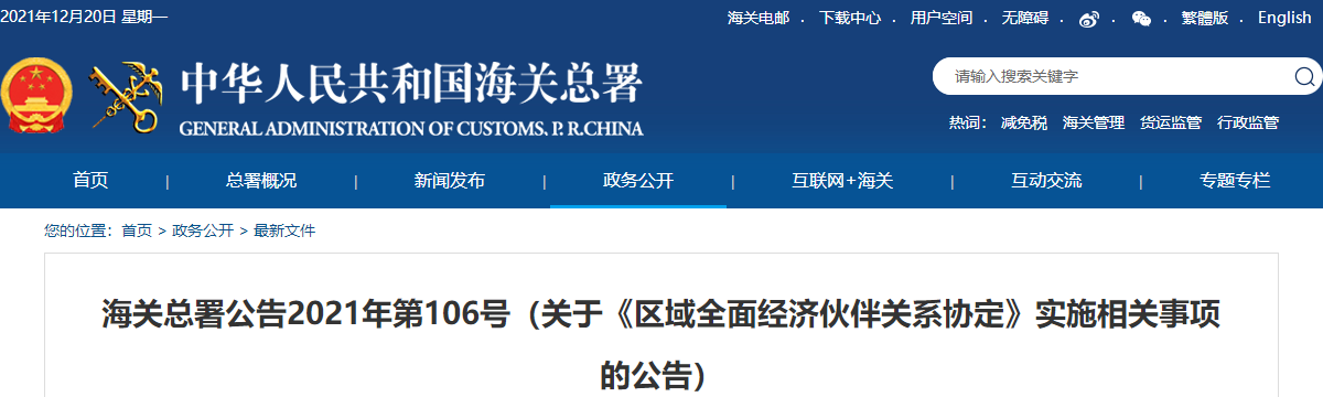 海關(guān)總署公告2021年第106號(關(guān)于《區(qū)域全面經(jīng)濟伙伴關(guān)系協(xié)定》實施相關(guān)事項的公告)